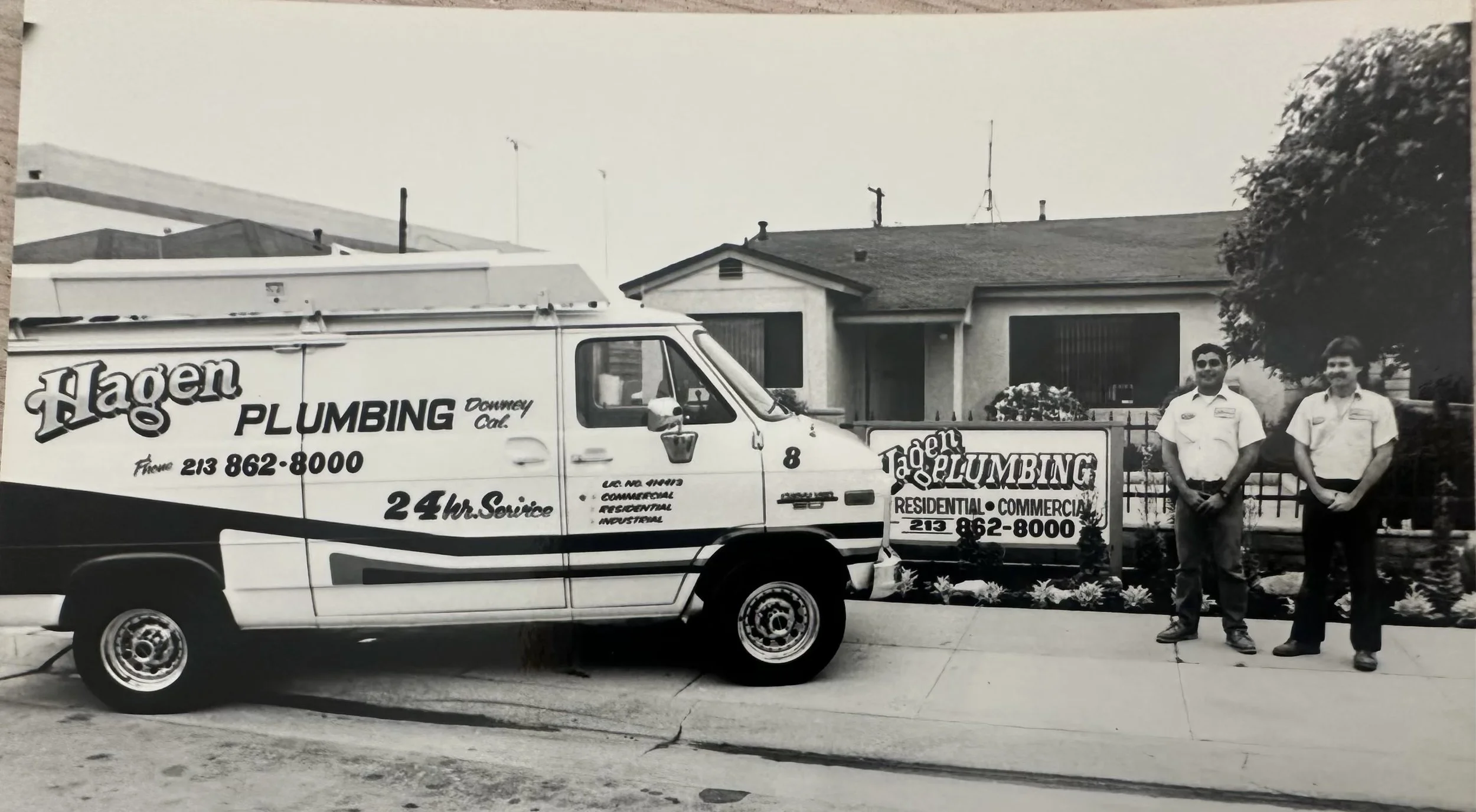 The company was originally founded in 1983 in Santa Fe Springs, California by Pete and Cheryle Hagen. Through the 1980’s the company became known around town for its custom painted brown Hagen plumbing trucks with the slogan “A Clean Job Starts with a Clean Truck” painted on the back. Pete believed quality work begins with a clean truck and that mantra continues 40 years later with a new fleet of Hagen Plumbing vans.